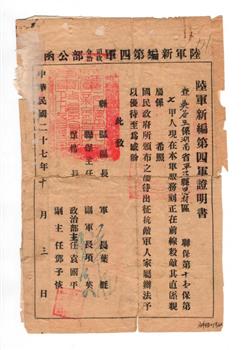 1938年新四军司令部政治部签发给平江县吴谷生家属的优待证明