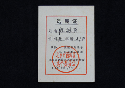 1990年北京市西城区选举委员会发给陈琮英的选民证