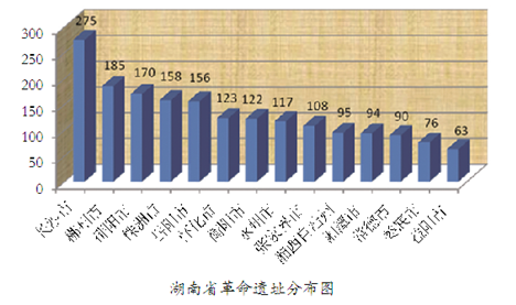 全省14个市州拥有革命遗址的绝对数,由多到少依次为:长沙市275处,占全省总数15.01%;郴州市185处,占全省总数10.10%;邵阳市170处,占全省总数9.28%;株洲市158处,占全省总数8.62%;岳阳市156处,占全省总数8.52%;怀化市123处,占全省总数6.71%;衡阳市122处,占全省总数6.66%;永州市117处,占全省总数6.39%;张家界市108处,占全省总数5.90%;湘西自治州95处,占全省总数5.19%;湘潭市94处,占全省总数5.13%;常德市90处,占全省总数4.91%;娄底市76处,占全省总数4.15%;益阳市63处,占全省总数3.44%。