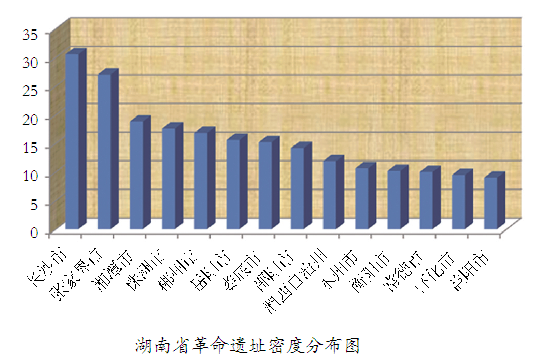 全省各市州平均每县市区拥有革命遗址数(遗址分布密度),由高到低依次为:长沙市30.56处;张家界市27.00处;湘潭市18.80处;株洲市17.56处;郴州市16.82处;岳阳市15.60处;娄底市15.20处;邵阳市14.17处;湘西自治州11.88处;永州市10.64处;衡阳市10.17处;常德市10.00处;怀化市9.46处;益阳市9.00处。