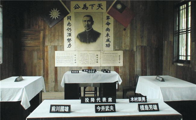 下午3点40分,日本降使今井武夫、桥岛芳雄、前川国雄,在陈应庄、陈昭凯等引导下步入会场,在下首的投降代表席坐下,今井武夫居中。