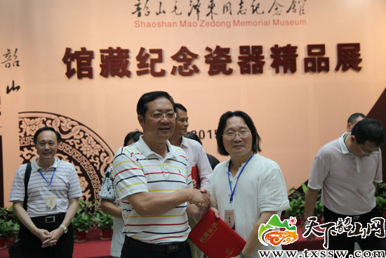 韶山毛泽东同志纪念馆馆长谭逻松(左)向景德镇东方御瓷文化传播公司董事长(右)颁发收藏证书 刘晓 摄