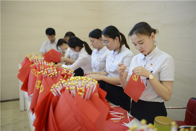 讲解员为观众准备免费发放的党旗