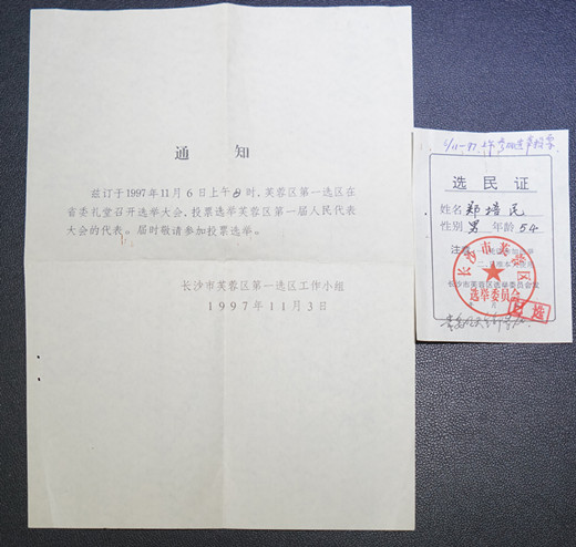 名称:1997年郑培民长沙选民证