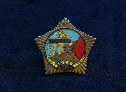 这枚纪念章铜板鎏金,整体是五角星样式,中间由圆形包围,背后有别针,正面左上方印“湘西剿匪胜利纪念”八个大字,正下方印“1950”字样,党徽、麦穗、扛红旗的人民解放军战士、处于顶尖的五角星以及徽章整体的五角星式样,无一不昭示着新中国的新气象。