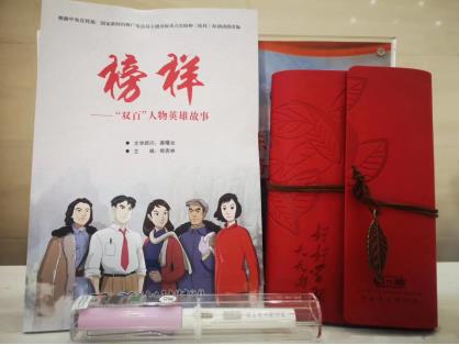 书籍《榜样》和印有党史馆logo的笔记本、钢笔