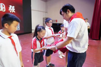 专题故事会结束后,为将基本党史知识传递给学生们,红色故事宣讲团采用答题互动、赠送书籍《榜样》和印有党史馆logo的笔记本、钢笔等方式,立马调动了现场学生们的积极性。“今年是抗美援朝入朝参战70周年;一面军旗上图案要素是镰刀、斧头、五角星、部队番号;我长大想当一名医生……”那一双双跃跃欲试的小手、一张张急切回答的小脸,将活动现场推向第一个高潮。互动答题结束后,党史馆馆长朱习文和虹桥小学校长周琳为同学们颁发精美礼品。