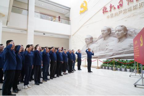 “我志愿加入中国共产党,拥护党的纲领,遵守党的章程……”在党史馆序厅,全体学员整齐列队,紧握右拳向着鲜红的党旗重温入党誓词。