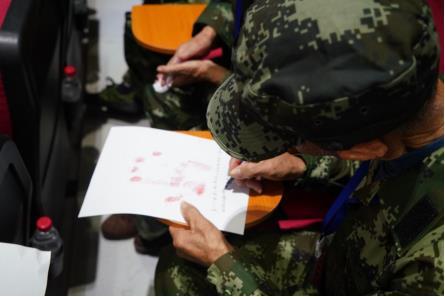 参观结束后,老兵爷爷们在三楼学术报告厅一笔一划地写下了自己的名字和部队番号,并按上了鲜红的“手掌印”以作纪念。随后,讲解员为抗美援朝老兵们朗诵了抗美援朝随军战地记者魏巍的作品《再见了,亲人》,老兵爷爷泪光闪烁,仿佛又回到了那个战火硝烟的朝鲜战场,见到了那群纯朴的朝鲜人民。