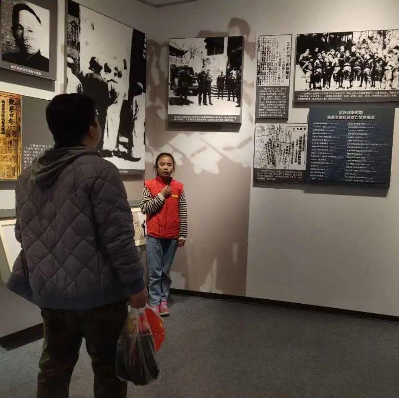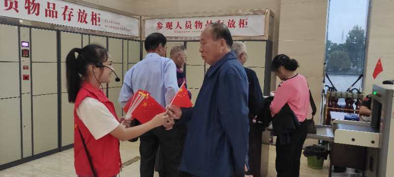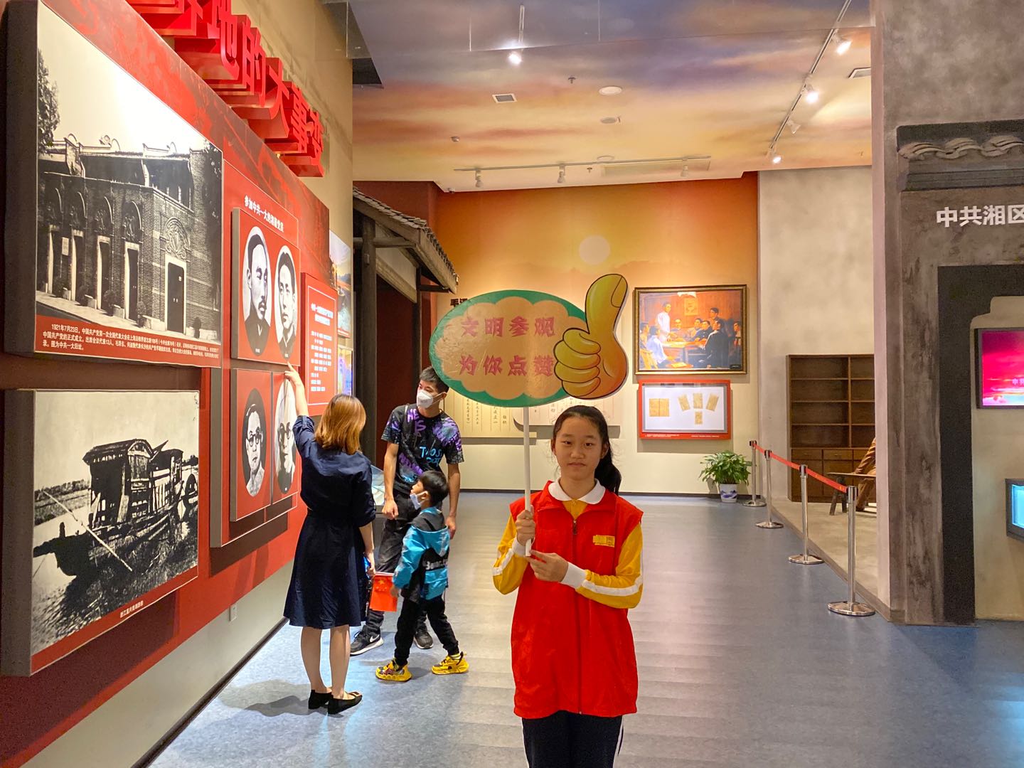 “欢迎来到湖南党史陈列馆!国庆期间,让我们一起带上国旗参观吧!”这是“微笑女孩”文轩麒给进馆的每一位观众赠送小红旗。