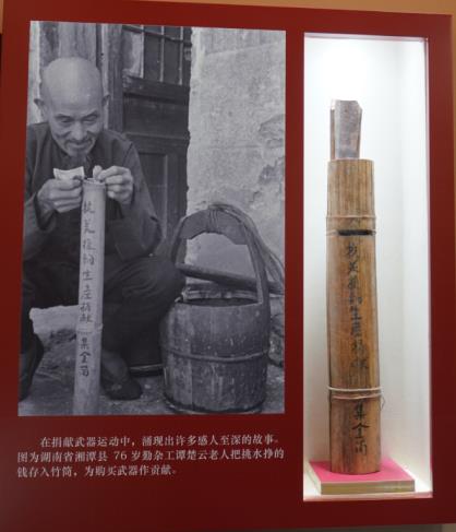 当时,谭楚云每月只有8元的收入。为了给志愿军捐钱买武器,从中国人民抗美援朝总会发出捐献武器号召之日起,他用竹筒做了一个存钱筒,上面钻了一个小孔,在竹筒上面写下“抗美援朝生产捐献集金筒”的字样。此后,每天用工余时间担水卖钱,把卖水的钱放进竹筒里一点点存起来,全部捐献给志愿军购买武器。这些钱虽然不多,但它体现了老人的一片诚挚爱国之心。
