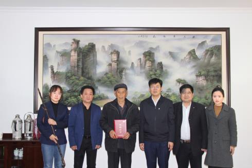 老红军欧国安之子欧永兴(左三)和孙女婿李先德(左二)捐赠欧国安生前用过的旱烟杆
