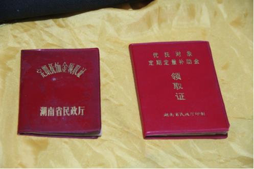 老红军侯宗元捐赠的1985年发的《定期抚恤金领取证》和1998年发《优抚对象定期定量补助金领取证》