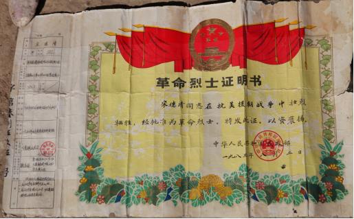 抗美援朝二级战斗英雄宋德清的革命烈士证明书