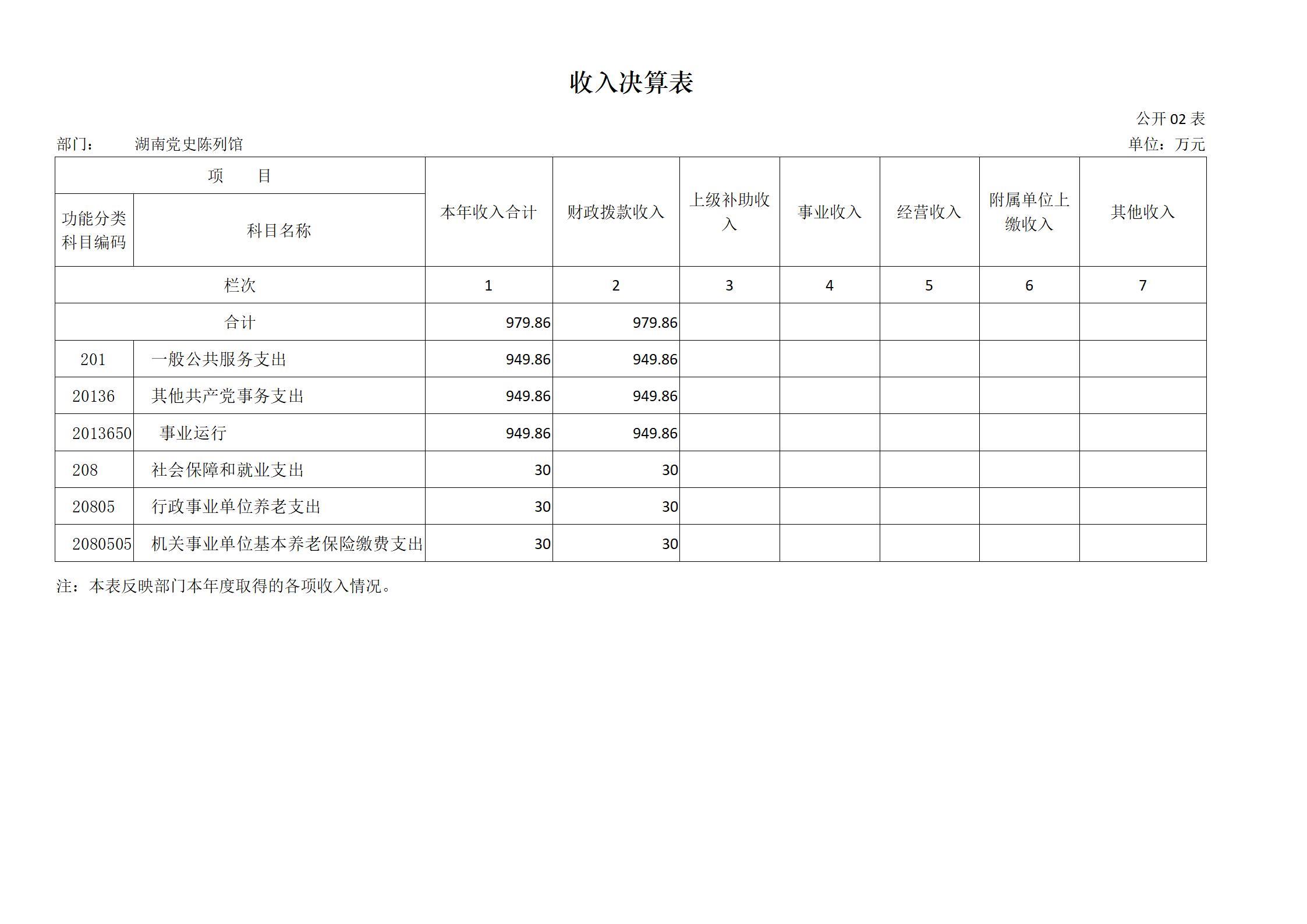 2021年度收入合计979.86万元,其中:财政拨款收入979.86万元,占100%;上级补助收入0万元,占0%;事业收入0万元,占0%;经营收入0万元,占0%;附属单位上缴收入0万元,占0%;其他收入0万元,占0%。
